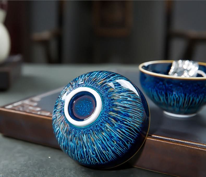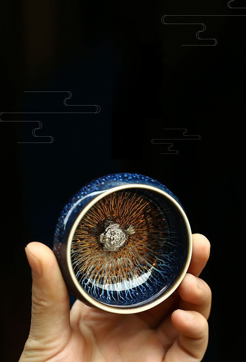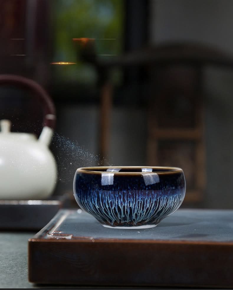 Jian Zhan, the iconic black-glazed tea bowl of the Song Dynasty (960–1279), originated from Jianyang, Fujian, and was named after the Jian Kiln. Flourishing alongside the ancient Chinese tea contest culture, its history dates back to the late Tang Dynasty. Known for its profound glaze resembling ink and mesmerizing patterns—such as "Hare's Fur" (fine silvery streaks), "Oil Spot" (metallic speckles), and "Yohen" (cosmic iridescence)—it is hailed as the "art of earth and fire". Emperor Huizong of Song praised Jian Zhan in his Treatise on Tea for its ability to contrast the whiteness of tea foam, while its thick body retained heat perfectly, embodying both utility and Song aesthetics.