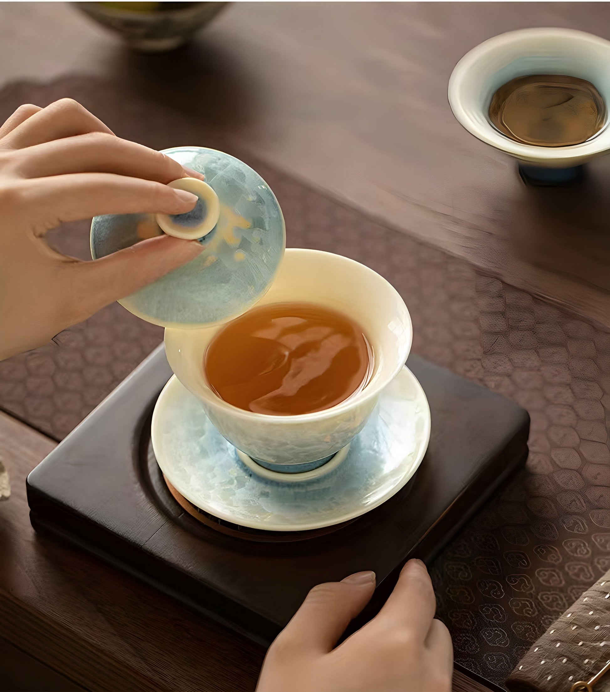 • Sancai ('Three Elements') - The lid (heaven), bowl (earth), and saucer (human) symbolize cosmic balance. Together, they create harmony during tea rituals.